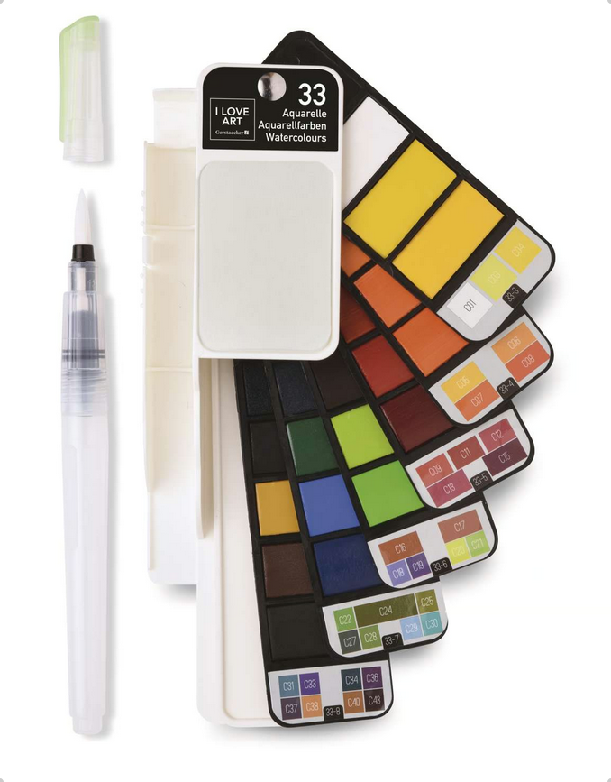 Die Honsell Aquarellfarben-Fächer enthalten alles, was zum Aquarellieren unterwegs benötigt wird: 1 Wassertankpinsel mit Schutzkappe, 1 Schwamm zum Abtupfen des Pinsel und 1 integrierte Mischpalette mit 2 Mulden. Dank der kompakten Fächergröße mit den extraflachen Näpfchen (Größe: ca. 0,1 cm x 1,5 cm x 3 cm) finden die Aquarellfächer in nahezujeder Tasche Platz und sind somit ideal geeignet für das Urban Sketching oder für Malreisen. Erhältlich sind Sets mit 18, 33 oder 42 lebendigen Aquarellfarben.