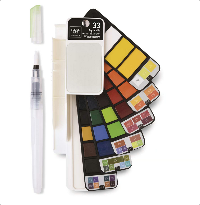 Die Honsell Aquarellfarben-Fächer enthalten alles, was zum Aquarellieren unterwegs benötigt wird: 1 Wassertankpinsel mit Schutzkappe, 1 Schwamm zum Abtupfen des Pinsel und 1 integrierte Mischpalette mit 2 Mulden. Dank der kompakten Fächergröße mit den extraflachen Näpfchen (Größe: ca. 0,1 cm x 1,5 cm x 3 cm) finden die Aquarellfächer in nahezu jeder Tasche Platz und sind somit ideal geeignet für das Urban Sketching oder für Malreisen. Erhältlich sind Sets mit 18, 33 oder 42 lebendigen Aquarellfarben.