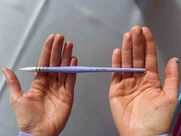 Jeder Pinsel wird traditionell per Hand gebunden, was höchste Präzision, perfekte Formstabilität und lange Lebensdauer garantiert. Die Fasern sind in Plastikkielen gefasst und auf lilafarbene Stiele gebunden, die nicht nur optisch hervorstechen, sondern auch angenehm in der Hand liegen.