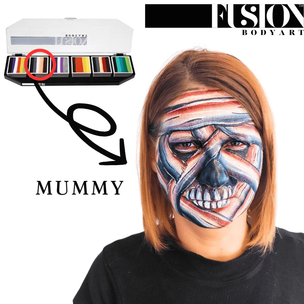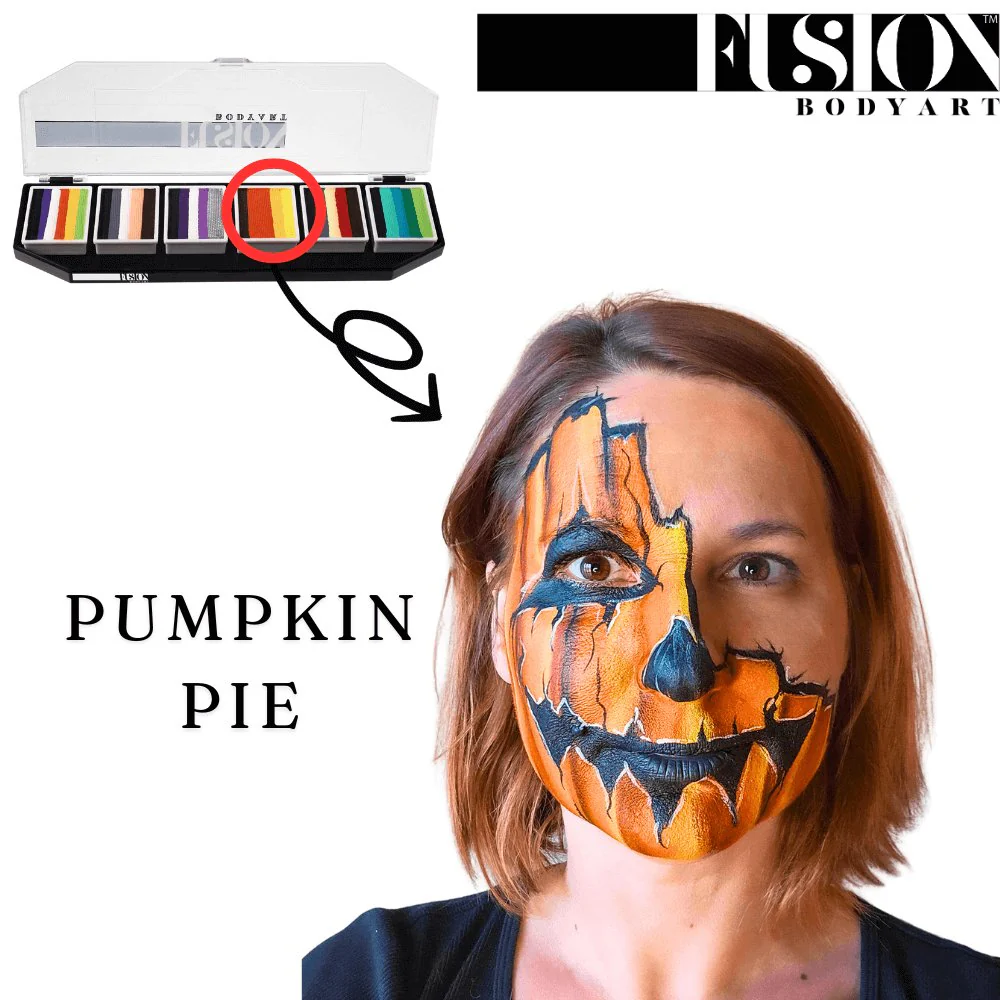 Für die Splitcakes von Fusion Body Art benötigen Sie lediglich einen flachen Schminkpinsel und Wasser. Für fließende Facepaintdesigns verwenden Sie einen 1-Zoll-Flachpinsel, um alle Farben in den Splitcakes aufnehmen zu können, oder verwenden Sie kleinere Flachpinsel, um nur einige der Farben aufzunehmen. Stellen Sie sicher, dass Sie mit einem leicht feuchten Pinsel beginnen und bei Bedarf mehr Wasser hinzufügen, indem Sie einfach eine Ecke des Pinsels leicht in das Wasser tauchen. Wenn Sie mit der One-Stroke Technik noch nicht vertraut sind, finden Sie im Internet jede Menge tolle Designideen, die Sie inspirieren werden. Diese Methode der Gesichtsbemalung spart Ihnen viel Zeit und wird Ihre Kunden beeindrucken, wenn sie gleichzeitig zusehen, wie diese wunderschönen Fusion Body Art-Farben von Ihrem Pinsel fließen. Sie können Ihre Splitcakes auch mit kleinen Schminkschwämmchen oder runden Tupfern verarbeiten. Wenn Sie einen Schwamm verwenden, tupfen Sie die Farben an der gewünschten Stelle auf die Haut und stupsen Sie dabei sanft hin und her, bis alle Farben gleichmäßig und kräftig sind.
